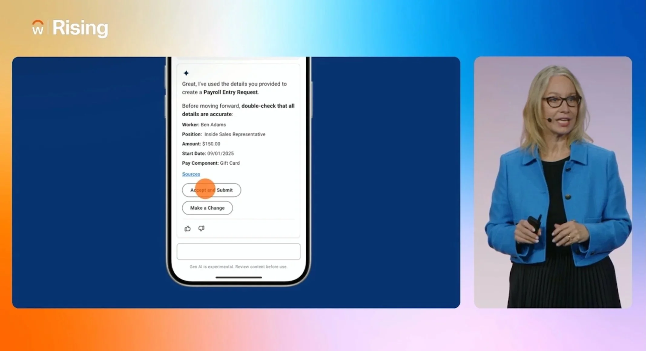 Jen cozier, our VP of Payroll, presenting in the Workday Payroll Strategy and Vision (PSV) session alongside the payroll data input animation.
