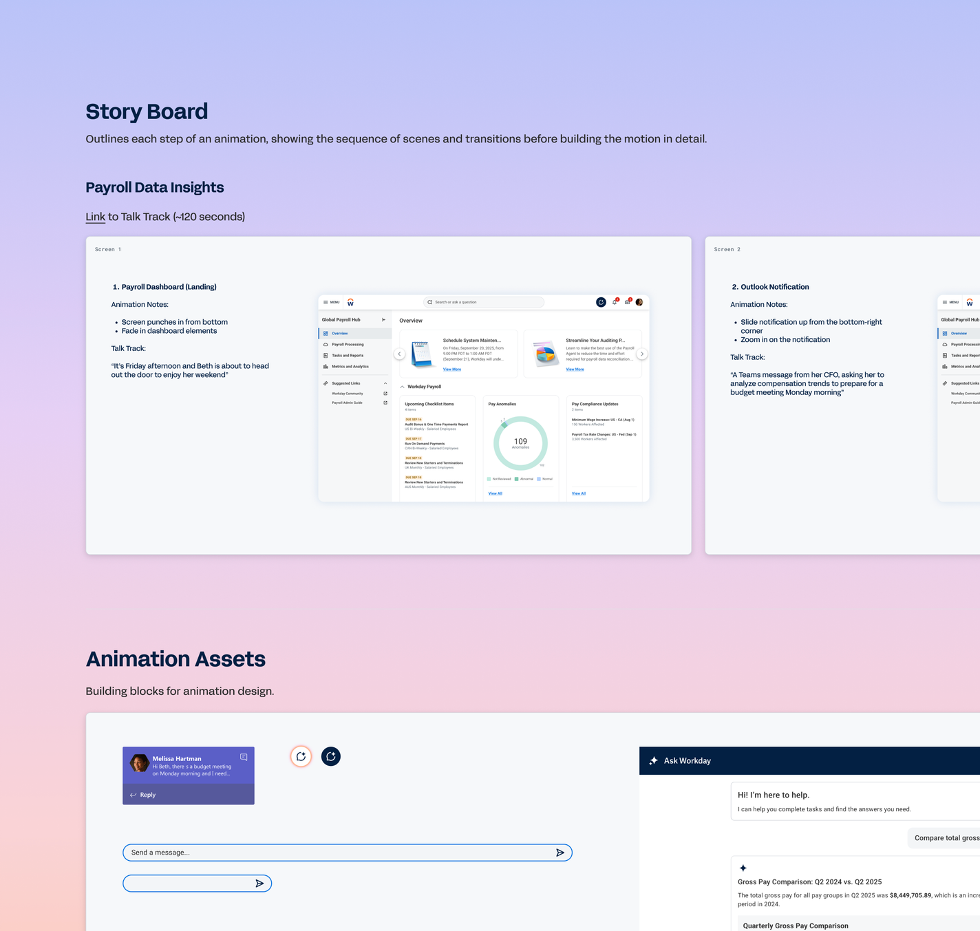 I collaborated with payroll SMEs and Rising speakers to create AI-driven storyboards and Jitter animations, ensuring the visuals aligned seamlessly with each presentation.