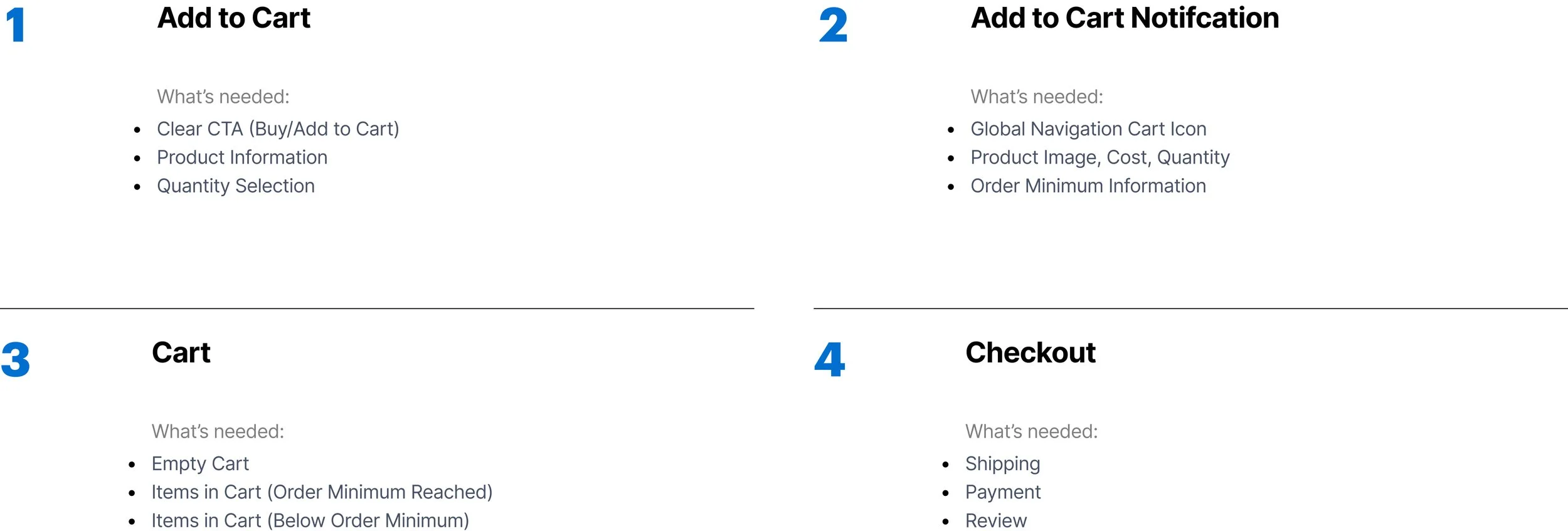 After going through my initial sketches with our PM, she noticed that I was designing out a typical cart for a B2C product. The designs showed products added to cart with no specific grouping. This would not work for our product which is a B2B marketplace. Areas I needed to reconsider: